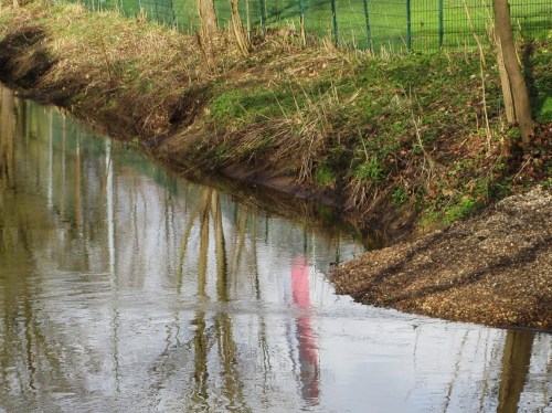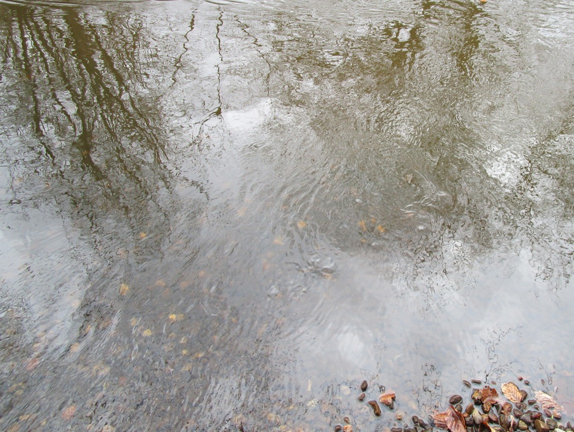 Im Ruhebereich spiegelt sich der Baumstamm, uferschützend entwickelte Turbulenz „bricht den Spiegel“.
