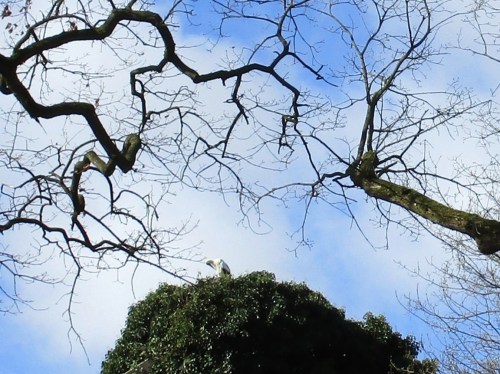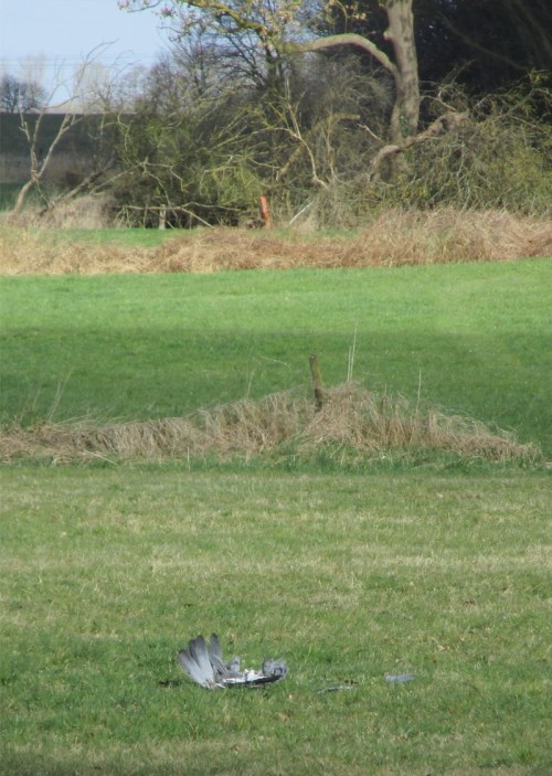 Vor dem Geesthang Holm liegt das geschilderte Winteropfer Graureiher nun nicht mehr Am Hang, sondern ist in die Wiese verschleppt, zerlegter als zuvor.