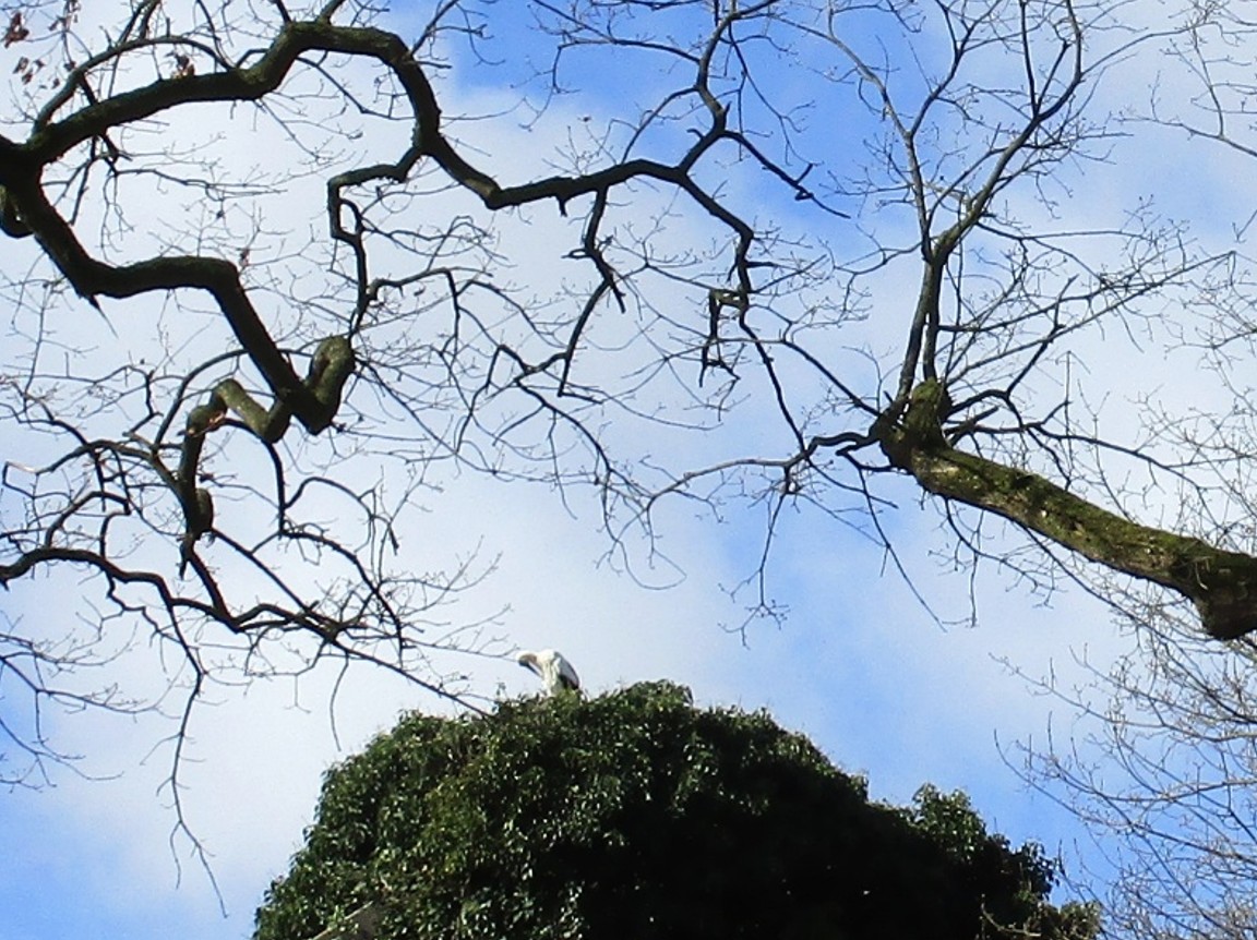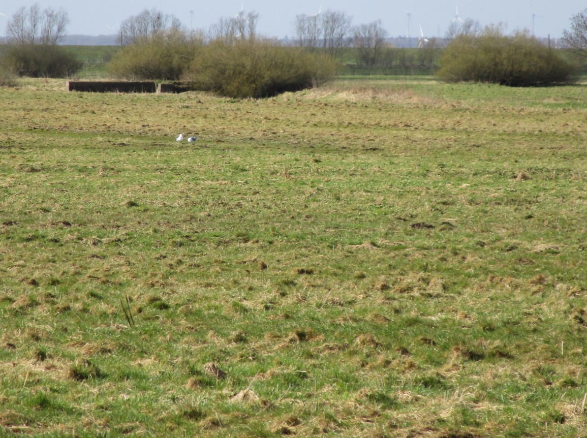 Nein, da ist kein zweiter Storch in der Nähe. Bei näherem Hinsehen balzt ein Paar Sturmmöwen. Von fern hatte ich bei Sehen von gereckten Hälsen im Umfeld eines Marschgrabens zunächst auf weiteres Storchenweiss getippt.