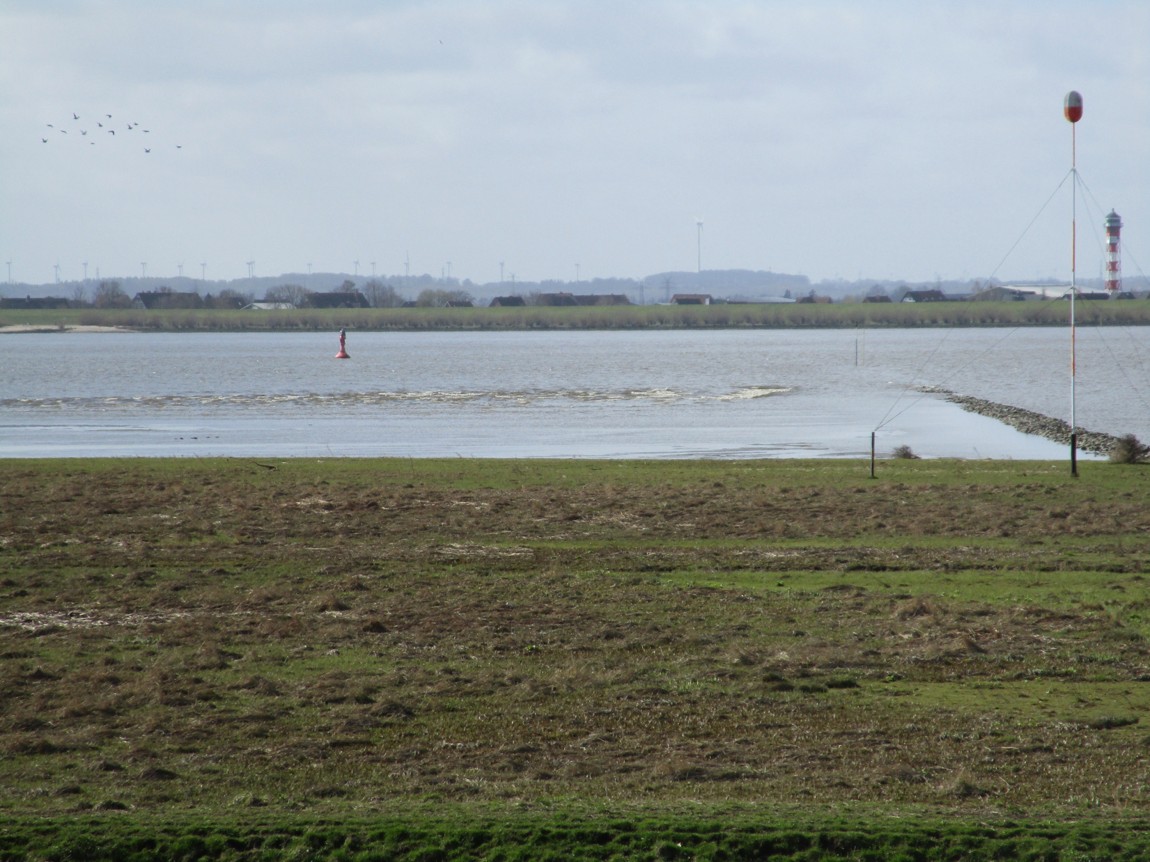 … die auflaufende Flut drückt Elbwasser über die Buhnenspitze, der starke Wind erzeugt auf dem Watt Gischt der sich überschlagenden Wellen.