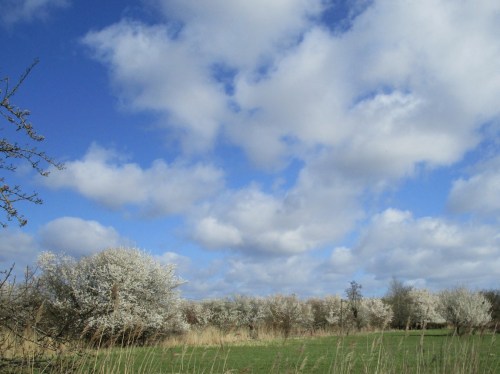 Der Geesthang ist nah. Das streckenhafte Weiss der frühlingshaften Marsch prägen die Kirschenverwandten, vor allem Schlehen und Mirabellengebüsche.