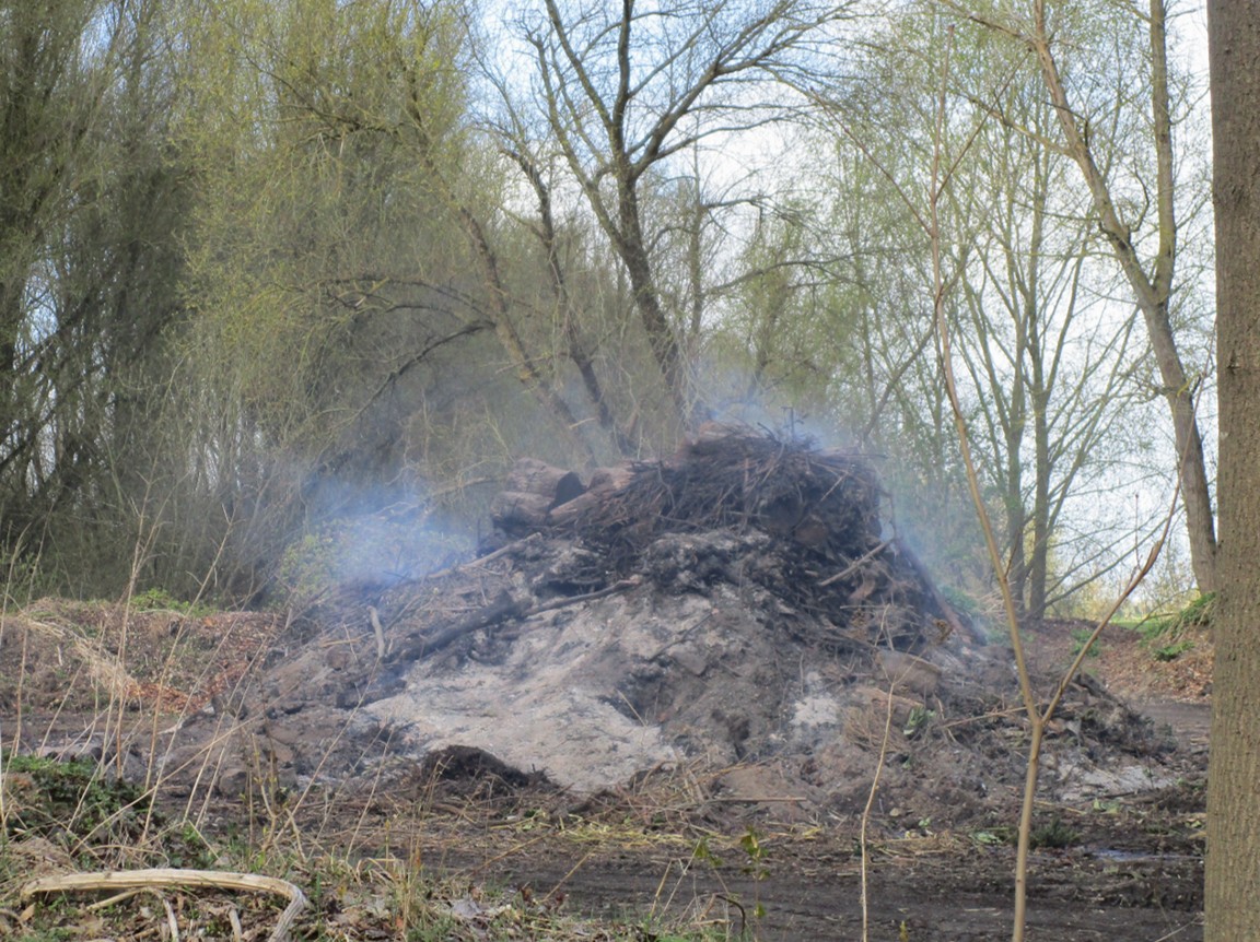 Und da ist es schon, das Hetlinger Osterfeuer – irre hoch der Abfallhaufen, erfahrungsgemäß noch Wochen vor sich hinschwelend, -mümpfelnd.