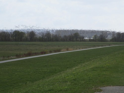 Tidehochwasser – da ziehen Massen, schwarz, flach über das bedeckte Süßwasserwatt gen Elbdeich, …