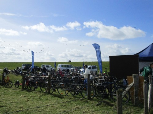 Jede Menge Fahrräder – ein geordneter Parkplatz ist vorbereitet. Das gute Wetter hat schon frühe Menschenmengen zum Kiebitzfest gebracht.