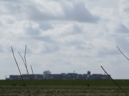 Der HH Hafenverkehr ruht nicht, schemenhaft (da die Digicam Schutzwallgras fokussierte) zieht Containerfrachter Cosco Shipping ALPS, 366 x 52 m, TG 13,8 bei möglichen 14 m (also vollbeladen) Elbe-aufwärts.