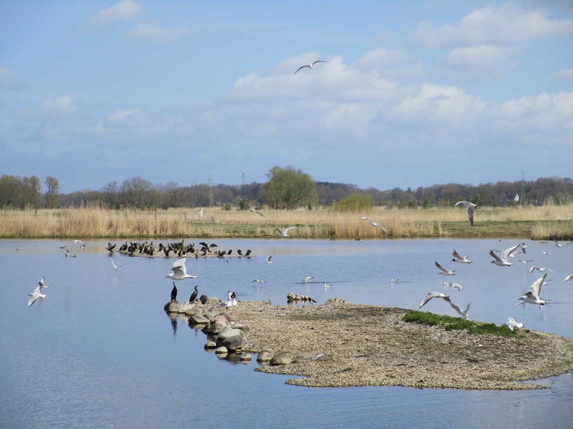Zum Ruhen ziehen sie sich dann gern – wie gesehen – ziemlich (zumindest vierbeinige)Beutegreifer-geschützt auf die Kiesinseln der Station zurück.