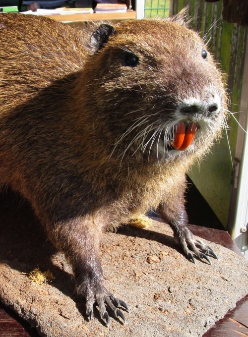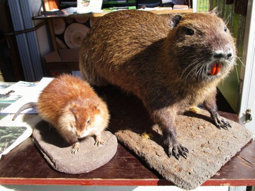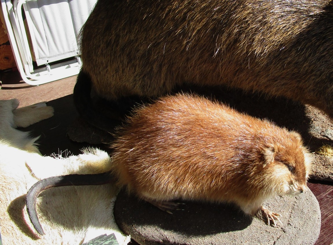 Am Jägerstand nutze ich die Gelegenheit zu diesem Vergleichsfoto – Zähne imposant besonnt, Bisam und … – nein, nicht Biber!