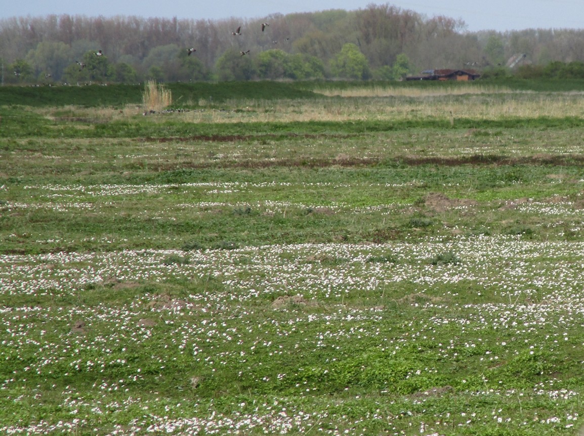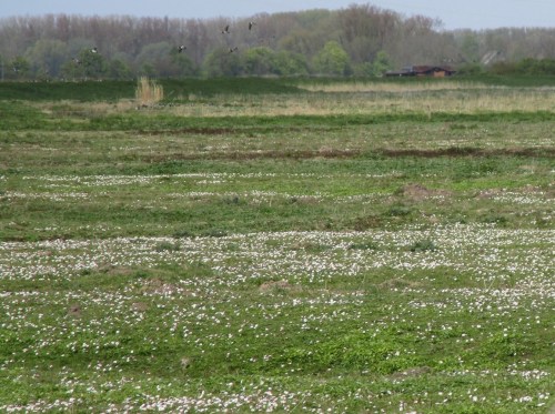 Hier handelt es sich um eine (der vielen), wo Gänsefraß alles verkahlte – Gänseblümchenwiese sagt man dazu. Flächeneigentümer und -nutzer hoffen Richtung 20. Mai, dass auch die letzten der noch herumvagabundierenden Nonnengänse in ihre Brutgebiete abgeflogen sind.