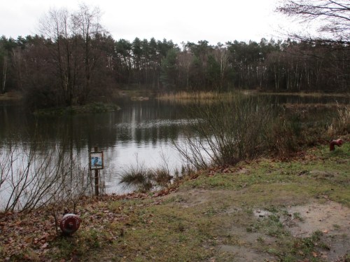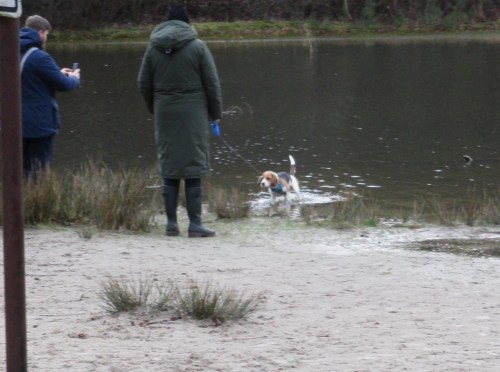 Am Feuerlöschteich – ein langer, dicker Ast im Wasser, rechts, weckte des Beagles Interesse. – Zu weit, heute nicht …! Schwimmtief entfernt wären Bauch und mehr nass geworden … (Achtung: helle Flexi-Leine).