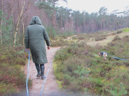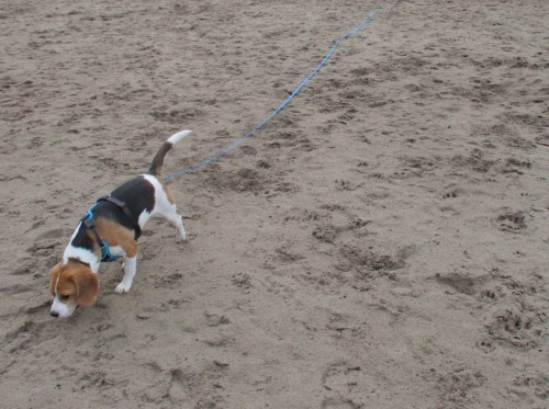 Auf entkusselter Fläche, Sand der früheren hiesigen Dünenlandschaft – Aufmerksamkeit! Irgendwas ist immer. (Auf freier Fläche ist die blaue Laufleine die richtige Wahl.)