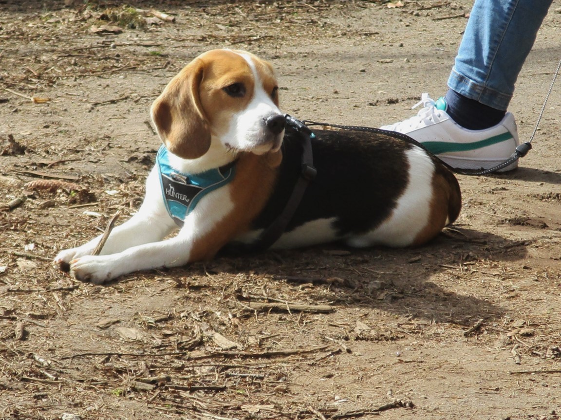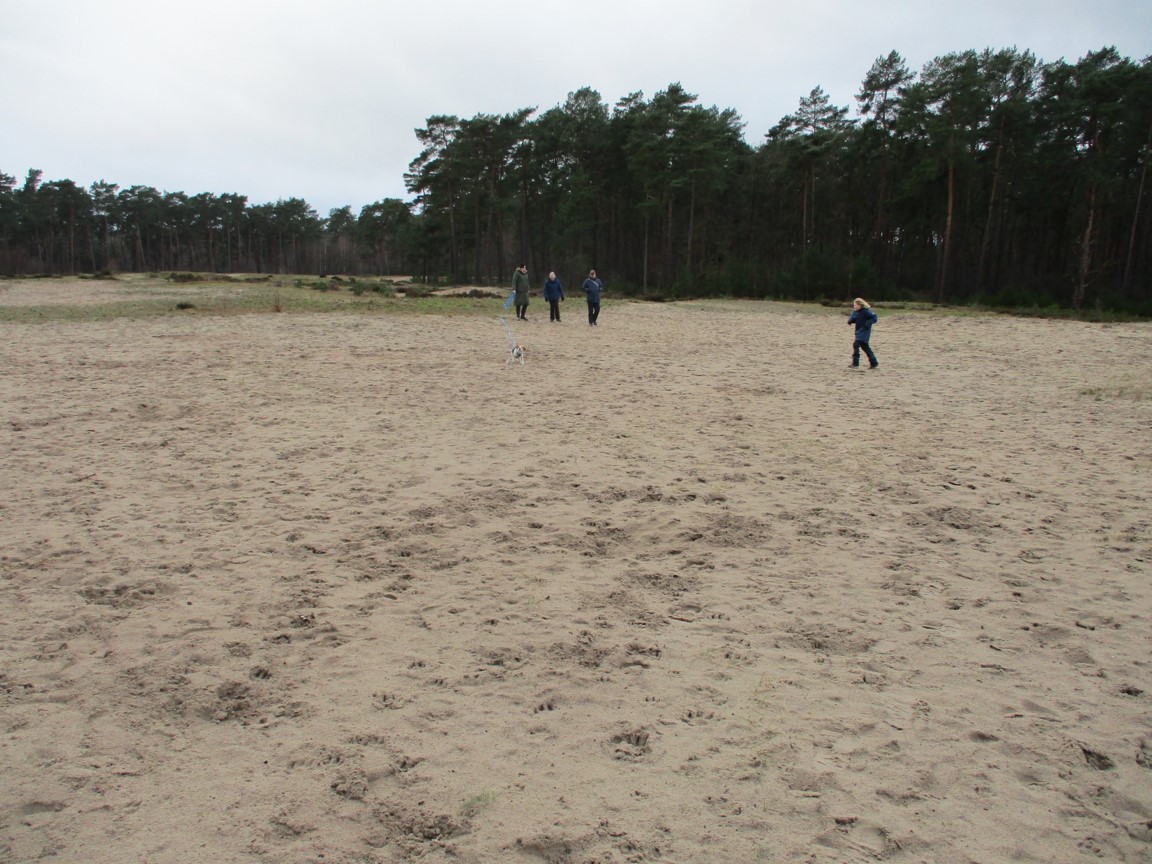 Auf entkusselter Fläche, Sand der früheren hiesigen Dünenlandschaft – Aufmerksamkeit! Irgendwas ist immer. (Auf freier Fläche ist die blaue Laufleine die richtige Wahl.)