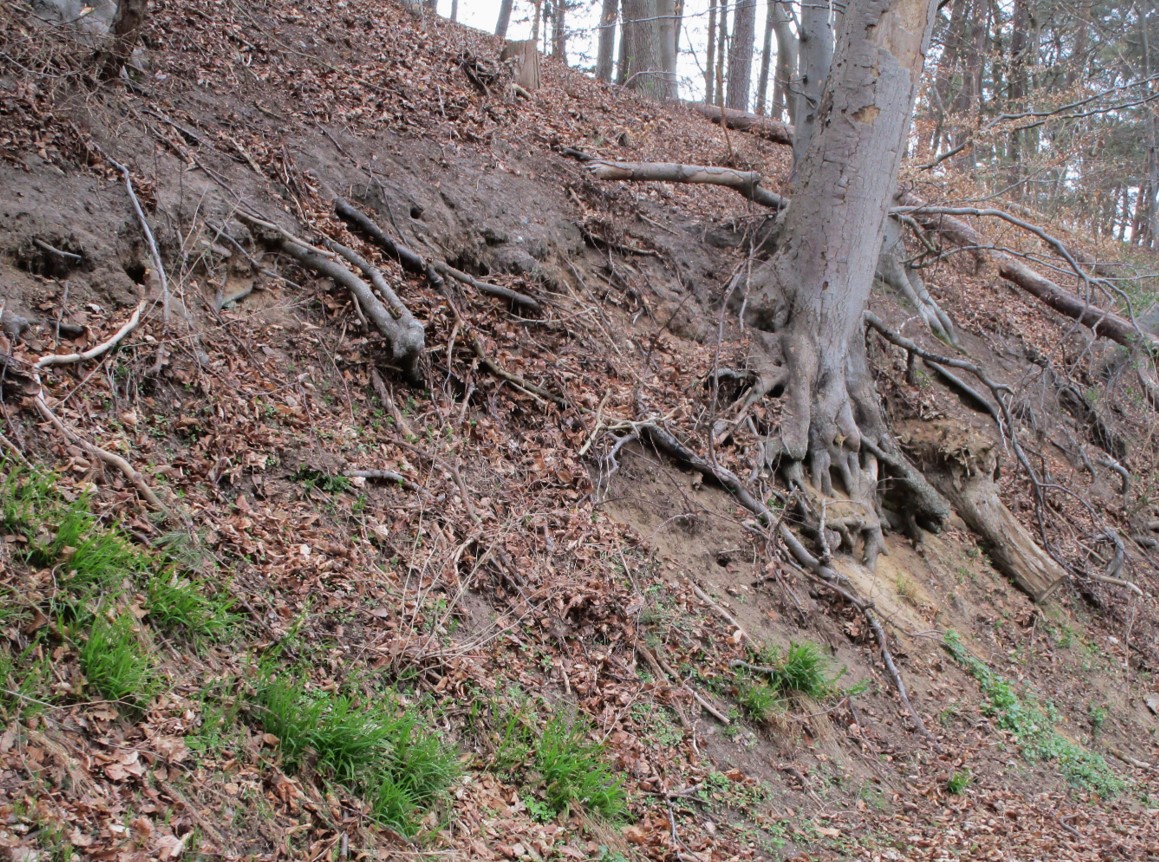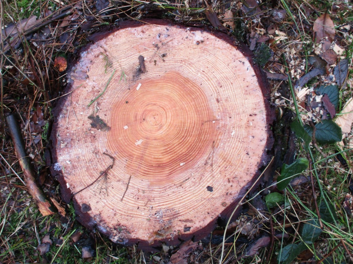 Wieder auf dem Hauptweg – Stumpf einer gefällten Kiefer, die Zeit …