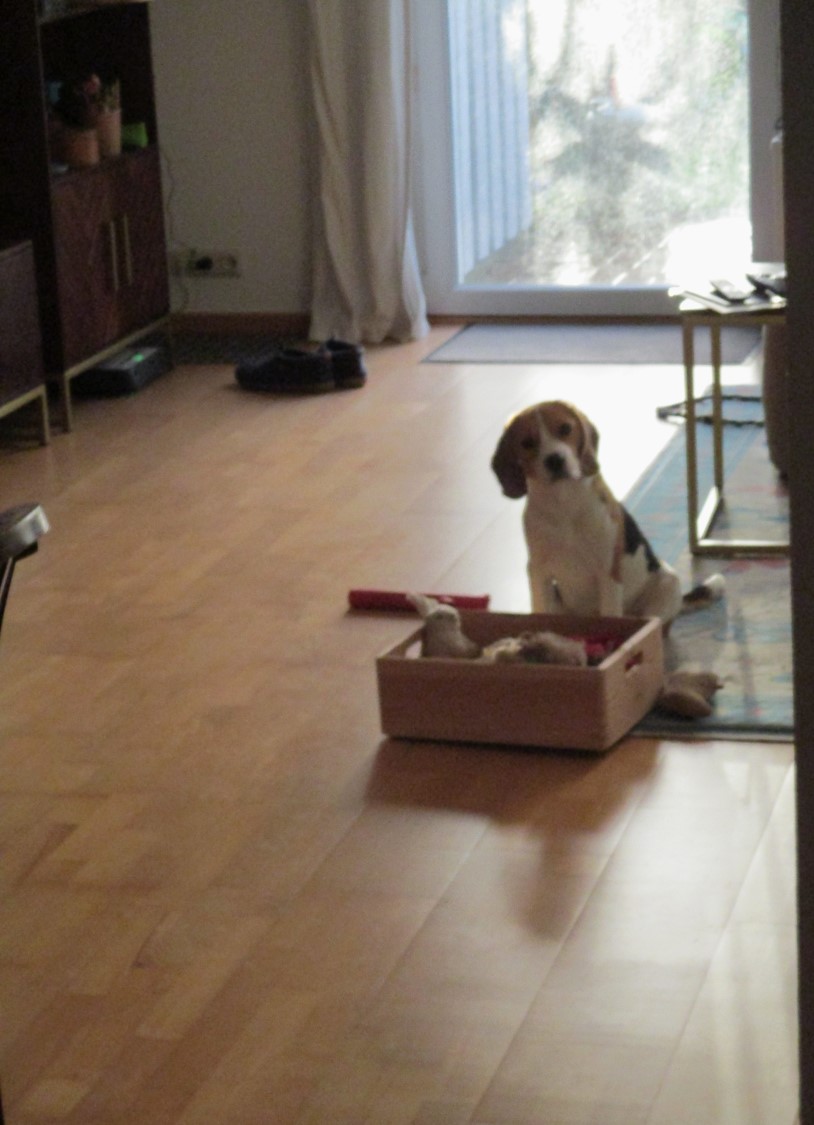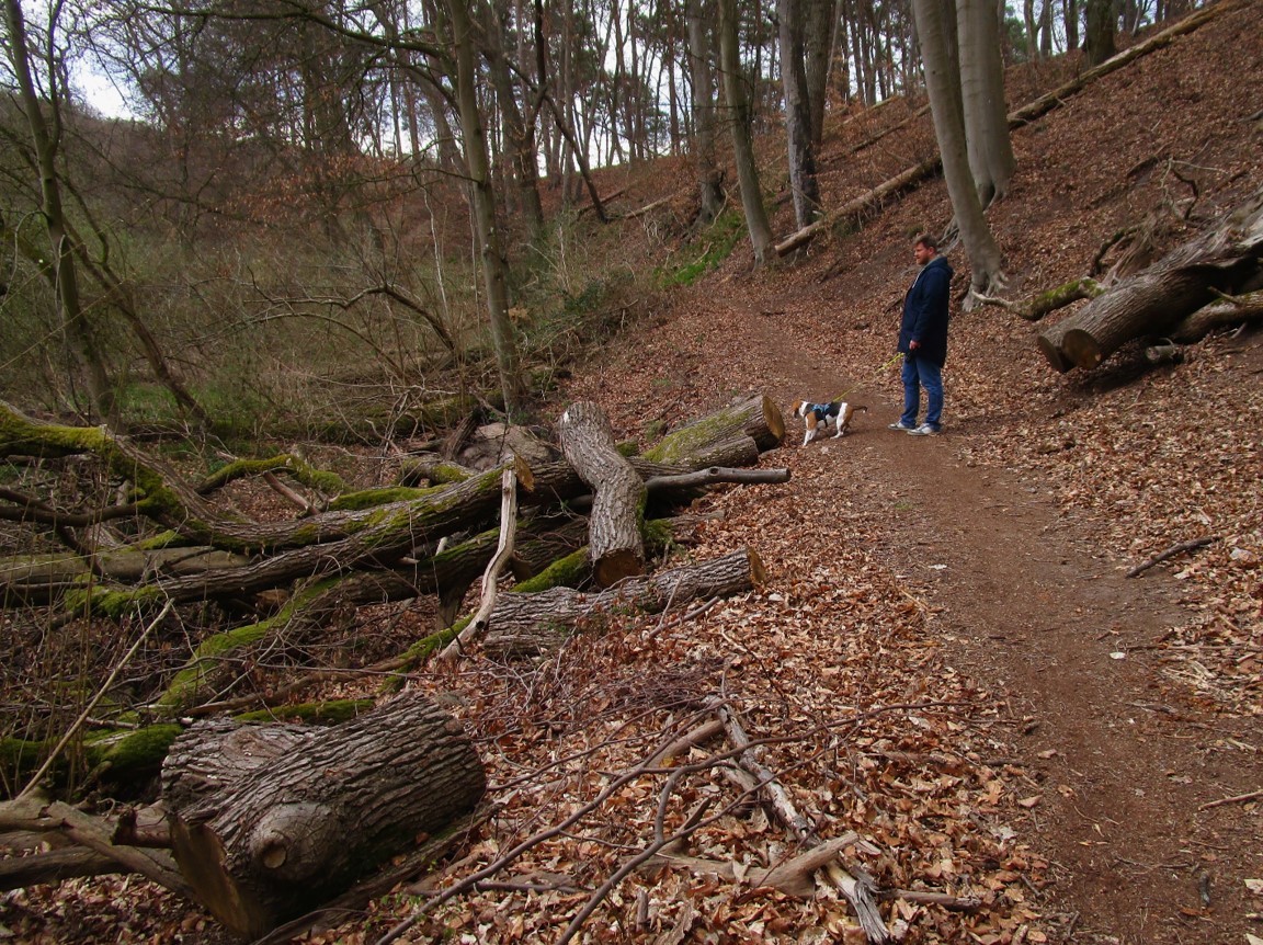Am Feuerlöschteich – ein langer, dicker Ast im Wasser, rechts, weckte des Beagles Interesse. – Zu weit, heute nicht …! Schwimmtief entfernt wären Bauch und mehr nass geworden … (Achtung: helle Flexi-Leine).