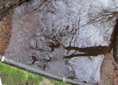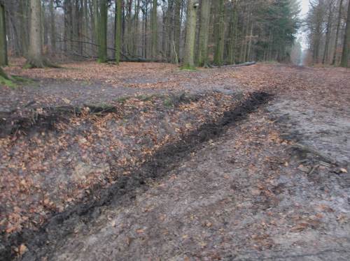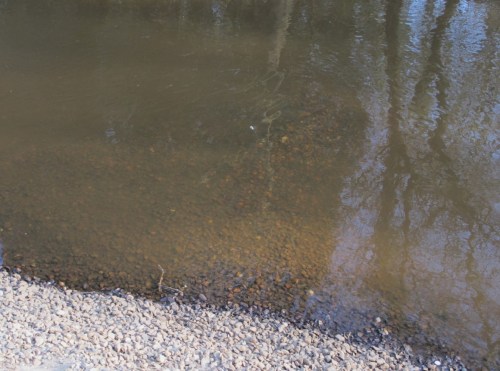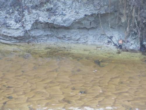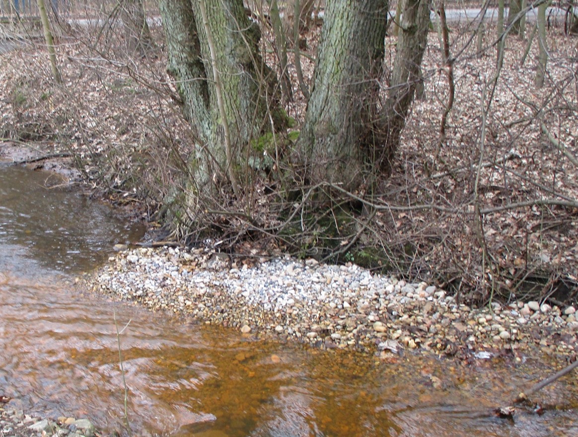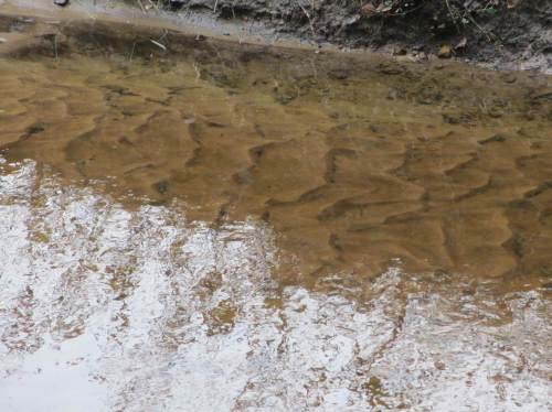 Überraschung beim Aussteigen: ein winziger Waldbach nebendran hat auf kleiner Fläche Feinkies gesammelt.