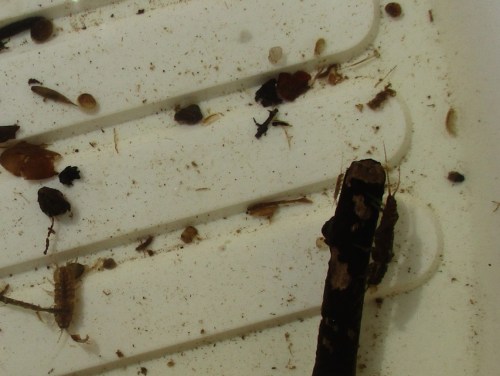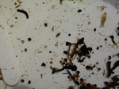 Fokussiert (die Digicam fokussiert die Baumspiegelung ringsum) – ganz klar: Laichbett, charakteristische Struktur im Kiesbett.