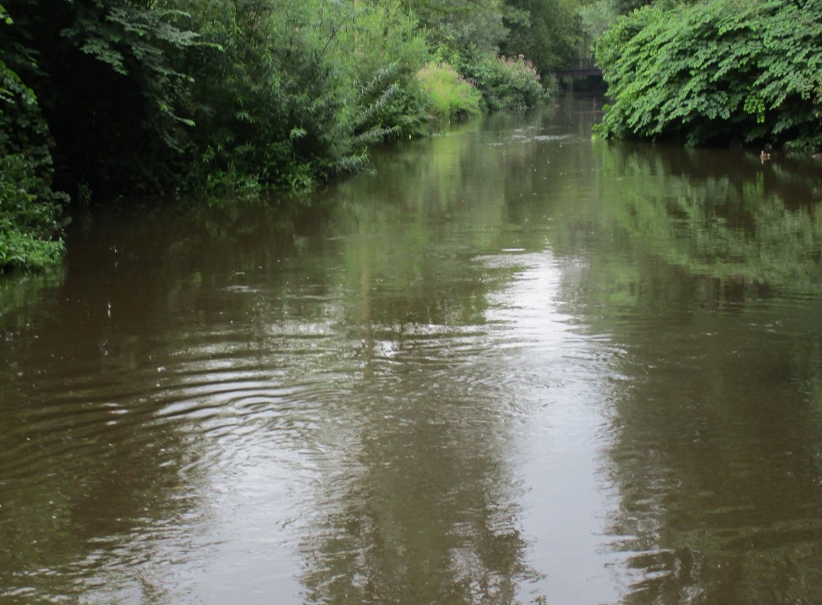 Zu erkennen sind die durch Wasserkraft veränderten beiden Kieszugaben, unmittelbar an der Brücke sowie querab eines ehemaligen Mäanders.