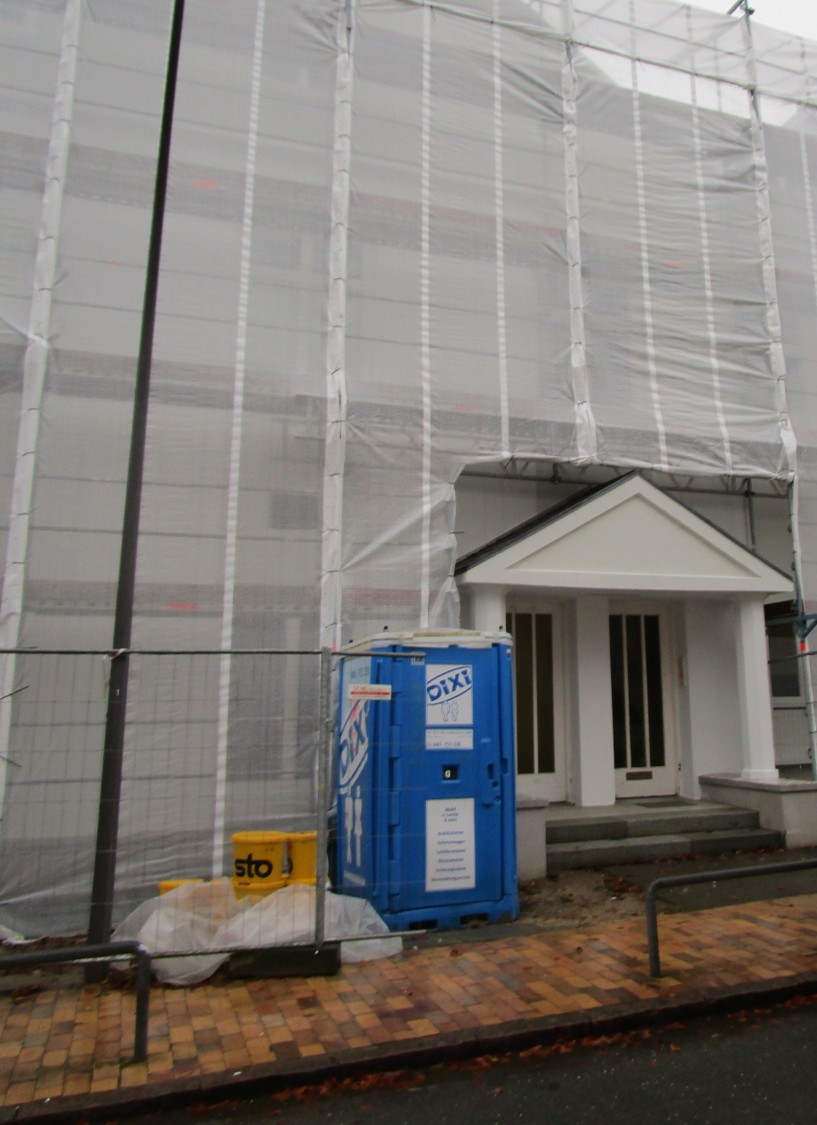 Griechisch-römisch anmutende Baustelle, Christo-, pardon, gegen E- und Immissionen verhüllt.
