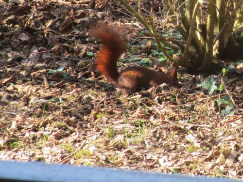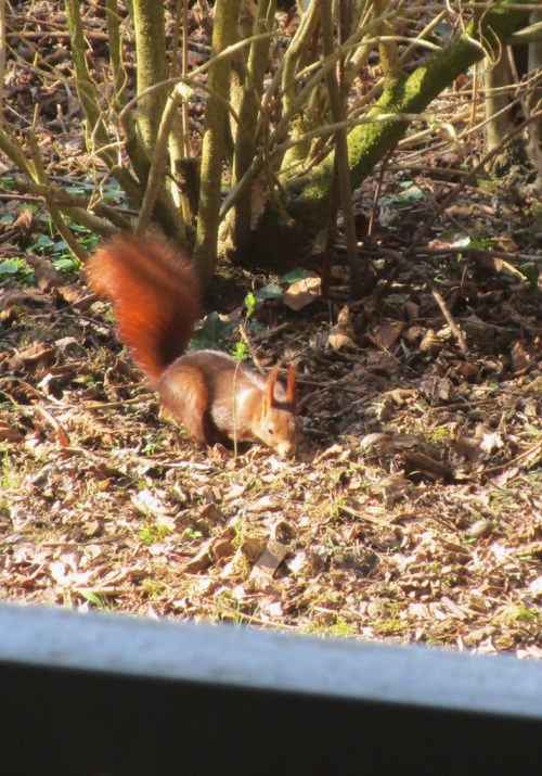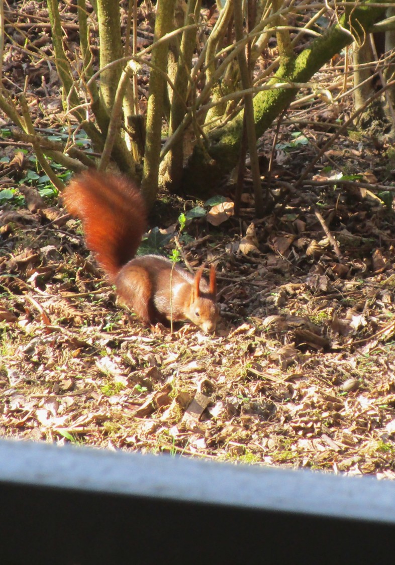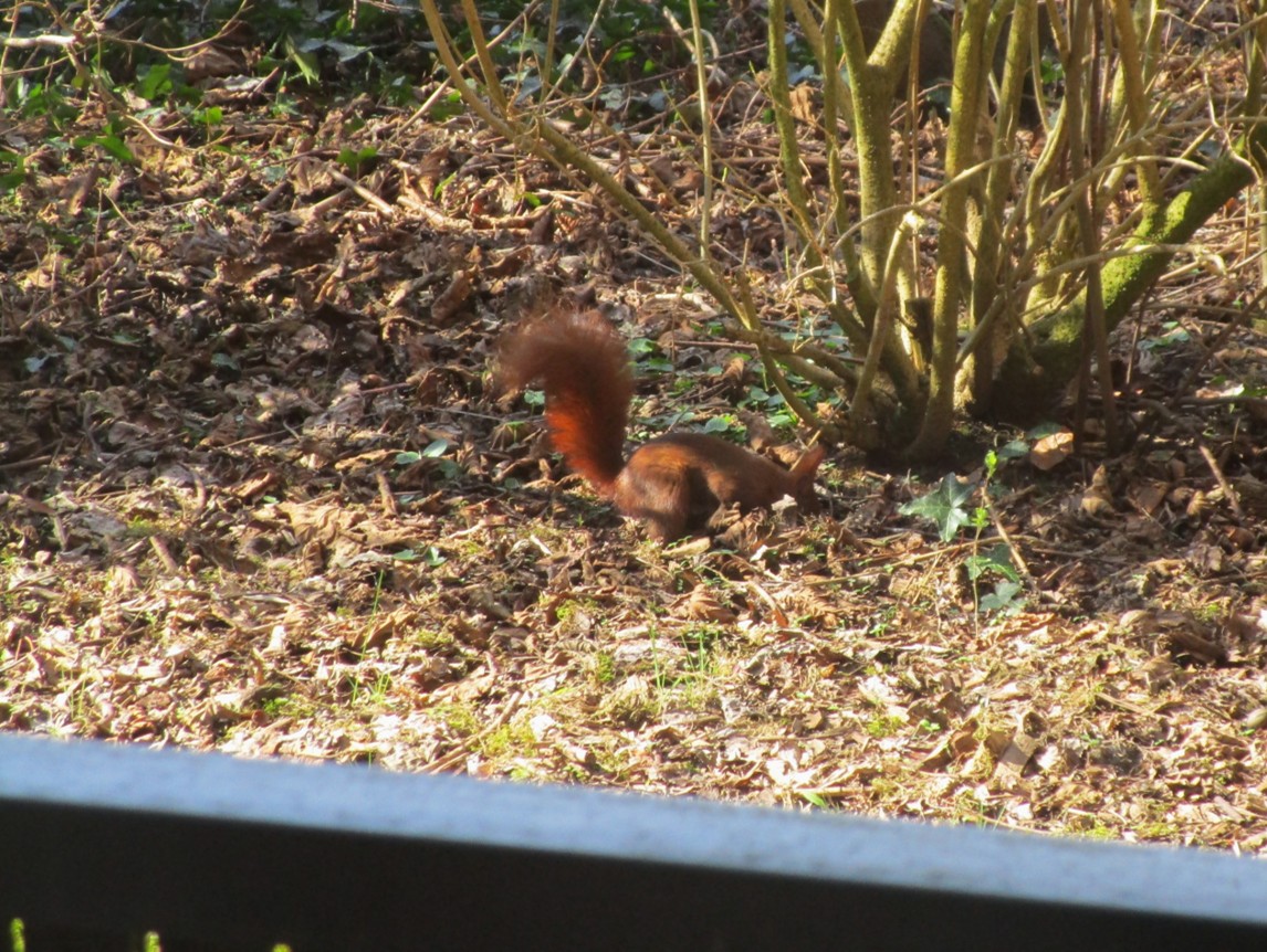 Der Blick nach draussen zeigt Stadtvögel – 2 verwilderte Stadttauben sowie die bekannten, eifrig nestbauen- und verteidigenden Saatkrähen.