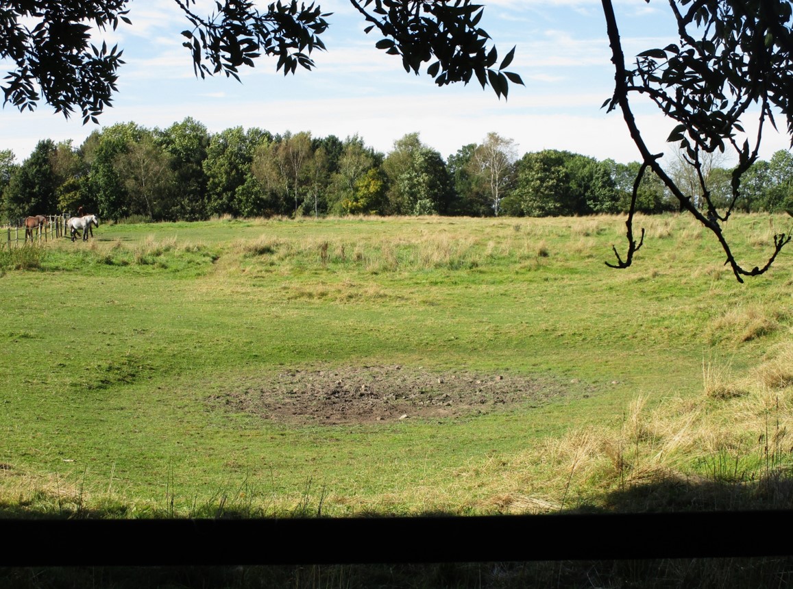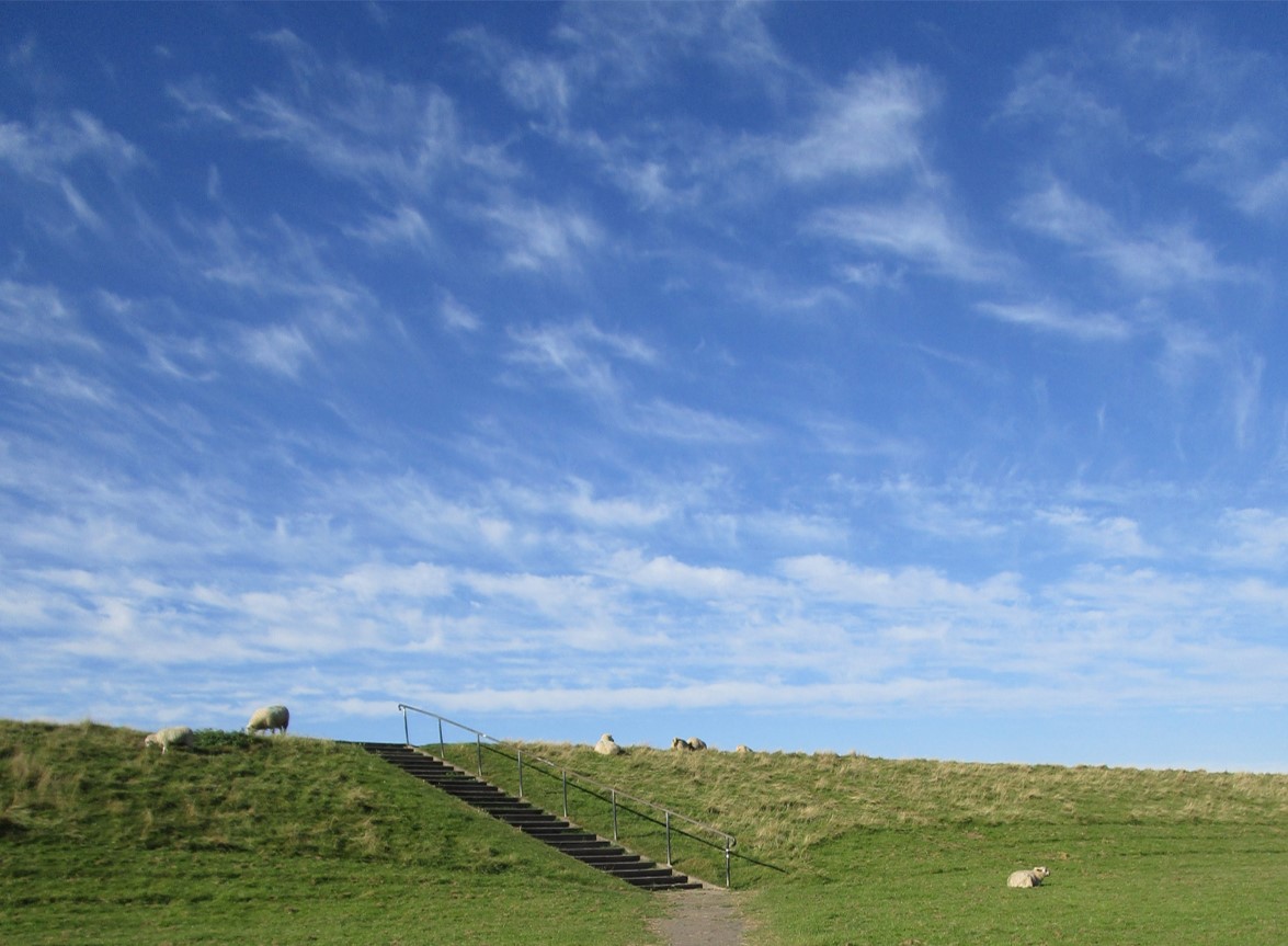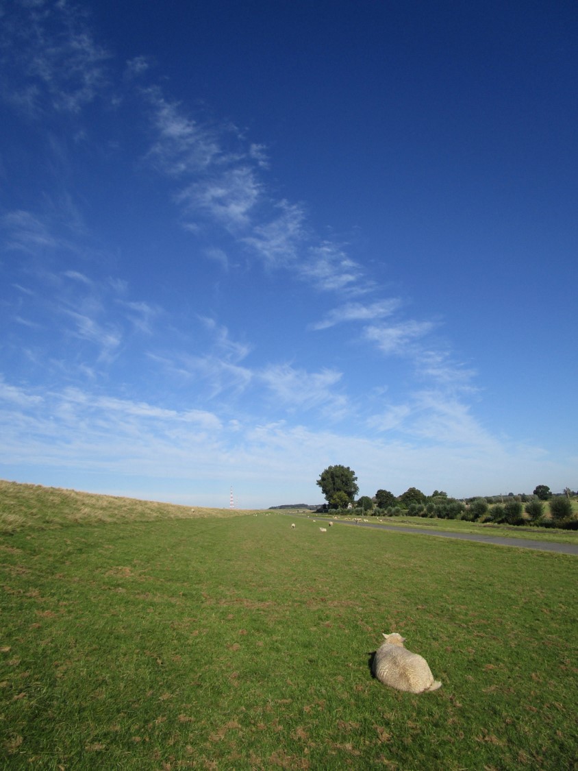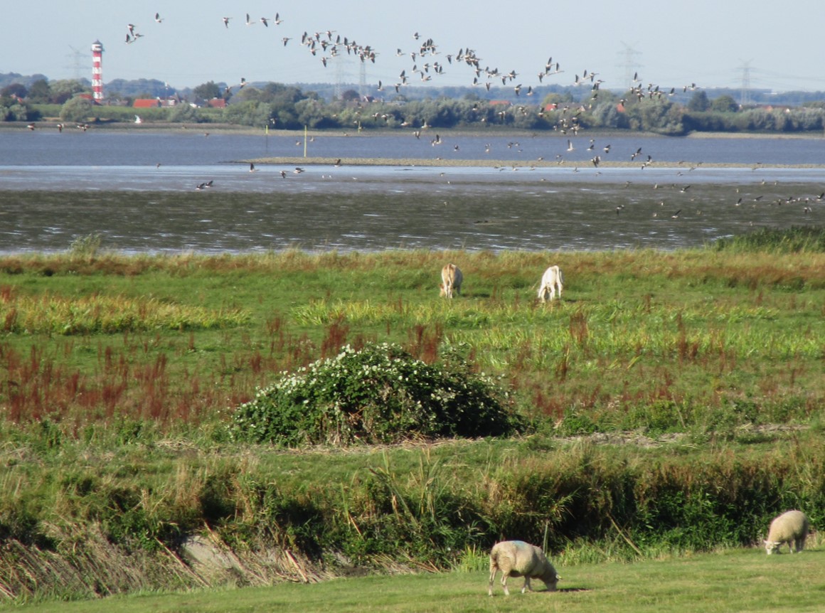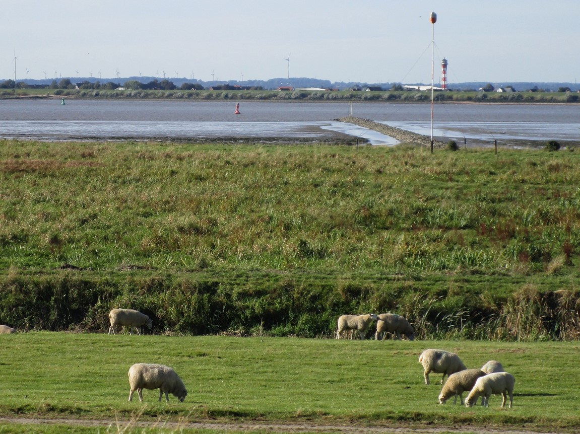 Blick von der Geest in die Marsch, Tideniedrigwasser – das Bett des Sauerbeck ist leergelaufen.
